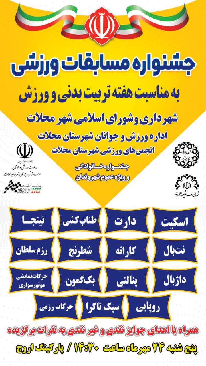 شهرداری و شورای اسلامی شهر محلات با همکاری اداره ورزش و جوانان شهرستان و انجمن های ورزشی شهرستان محلات بمناسبت هفته تربیت بدنی و ورزش برگزار می کند: